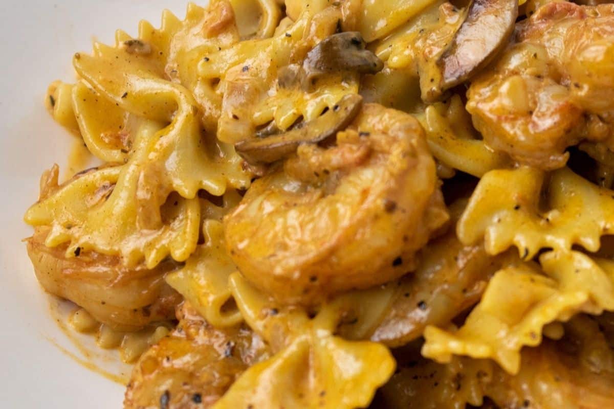 - Pasta: Use a pasta that holds sauce and gives a good bite with the shrimp and mushrooms. Farfalle (bow-tie) is my first choice, followed by rotini. Long pastas like fettuccine, linguine, or tagliatelle also work well. Penne works, but can feel a bit heavy in this dish.