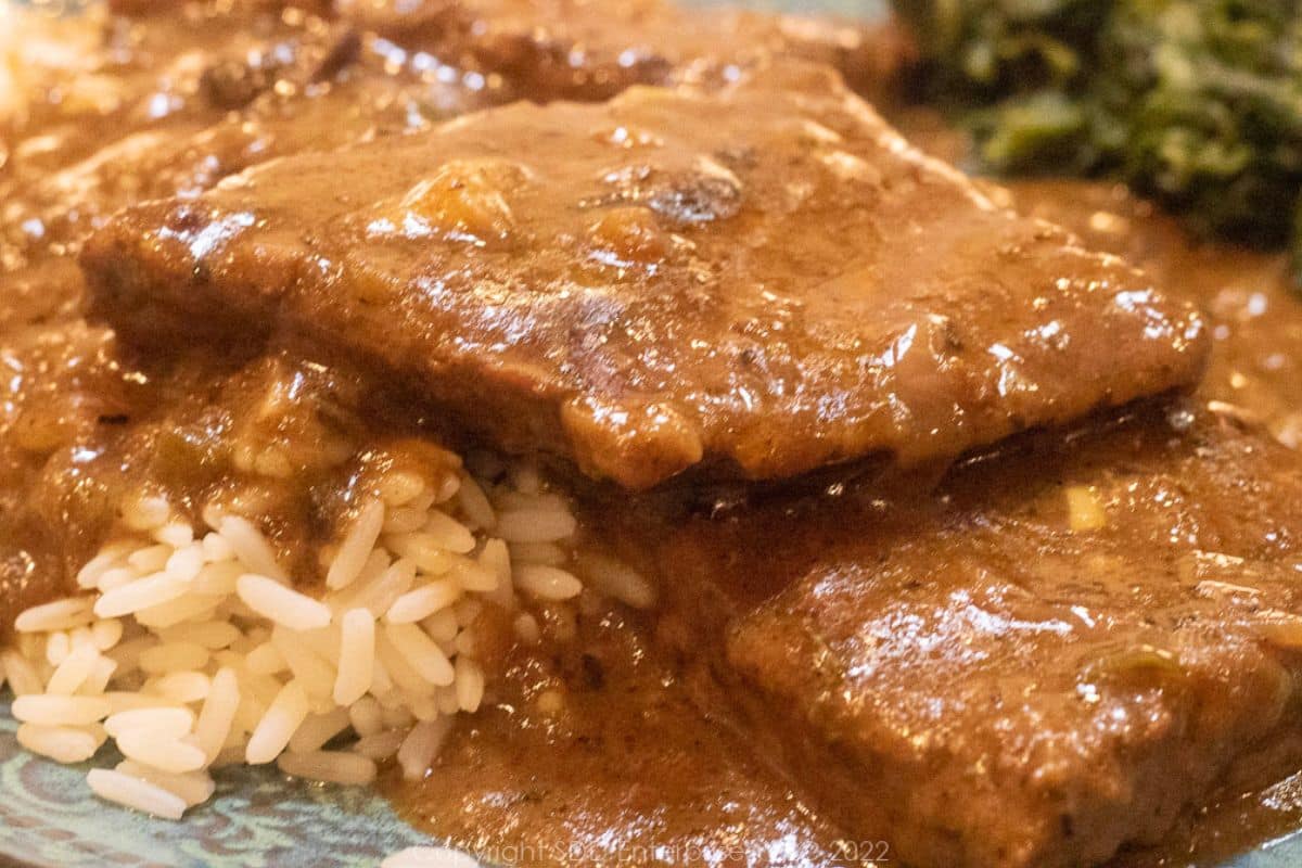 This recipe was developed using top round beef. Round steak is a lean, budget-friendly cut from the hind leg of the cow. Because it’s from a well-used muscle, it’s firm and not as naturally tender as premium steaks, but it has a mild, beefy flavor. It benefits from slow, moist cooking methods like braising or smothering, which break down the connective tissue and turn it fork-tender. It’s typically sold as top round, bottom round, or eye of round, and works beautifully in dishes like Swiss steak, smothered steak, and beef tips with gravy. Check out the Substitutes section above.